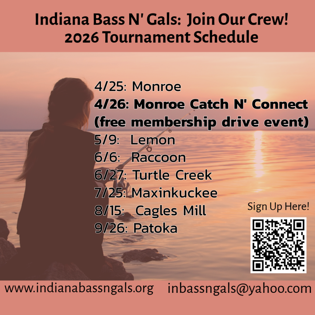 The Indiana Bass’N Gals are hosting a recruiting tournament on Lake Monroe on Saturday, April 26th from 8am to noon. It will be a team tournament. Boaters and non-boaters will be fishing together against other boater and non-boater teams. There is no cost to attend this event however you do need to pre-register online using the QR code. After the tournament we will have a social hour with drinks and snacks. We will also be giving away a rod and reel combo and goodie bags. You can also fish any of the regular season tournaments as a guest for just $5. If you or someone you know is a Hoosier lady looking for a women’s fishing organization this is a perfect opportunity for you to get a look into our club!