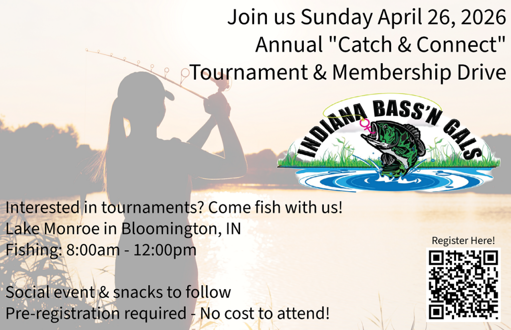 The Indiana Bass’N Gals are hosting a recruiting tournament on Lake Monroe on Saturday, April 26th from 8am to noon. It will be a team tournament. Boaters and non-boaters will be fishing together against other boater and non-boater teams. There is no cost to attend this event however you do need to pre-register online using the QR code. After the tournament we will have a social hour with drinks and snacks. We will also be giving away a rod and reel combo and goodie bags. You can also fish any of the regular season tournaments as a guest for just $5. If you or someone you know is a Hoosier lady looking for a women’s fishing organization this is a perfect opportunity for you to get a look into our club!